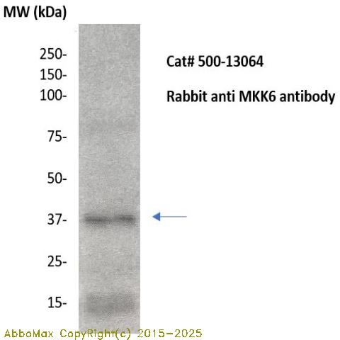 "MKK6, Mitogen-activated protein kinase kinase 6 (MKK6), also known as MEK6, is a dual specificity protein kinase that belongs to the MAP kinase family. It is closely related MKK3 are activated by proinflammatory cytokines and environmental stresses. MKK6 is activated by mitogenic and environmental stress, and participates in the MAP kinase-mediated signaling cascade. It phosphorylates and thus activates MAPK14/p38-MAPK. This kinase can be activated by insulin, and is necessary for the expression of glucose transporter. Expression of RAS oncogene is found to result in the accumulation of the active form of this kinase, which thus leads to the constitutive activation of MAPK14, and confers oncogenic transformation of primary cells. The inhibition of this kinase is involved in the pathogenesis of Yersina pseudotuberculosis"