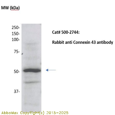 "Connexin 43 is a member of the connexin gene family. The connexins are a group of gap junction proteins which form a hexamer to compose a connexon. Clusters of connexons form a gap junction through which low molecular weight proteins may diffuse from cell to cell. Several mammalian cells with malignant phenotypes exhibit decreased connexin expression and gap junction communication. In Src transformed cells, there is a decrease in gap junctional communication, which appears to be associated with tyrosine phosphorylation of connexin 43. Activated c-Src phosphorylates the C-terminal tail of connexin 43 on Tyr 265, resulting in a stable interaction between both proteins, which leads to inhibition of gap junctional communication. In addition to tyrosine phosphorylation, connexin 43 has also been shown to be phosphorylated on serine in the absence of Src kinases and on both serine and tyrosine in cells expressing Src kinases, such as c-Src and/or pp60v-Src. In human vascular endothelial cells, connexin 43 is posttranslationally modified during mitosis. Mitosis-specific phosphorylation of connexin 43 correlates with the transient loss of gap junction intercellular communication and redistribution of connexin 43."