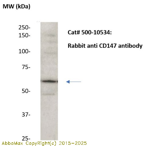 "CD147 or EMMPRIN (extracellular matrix metalloproteinase inducer) is a plasma membrane protein that is important in spermatogenesis, embryo implantation, neural network formation, and tumor progression. This protein is also a member of the immunoglobulin super-family, it is a 58kDa protein with two immunoglobulin domains that was originally purified from the plasma membrane of the human LX-1 lung carcinoma cell line. CD147 has been localized on the outer surface of tumor cells, where it interacts withfibroblasts to stimulate the expression of matrix metalloproteinases (MMPs). CD147 inhibition has been proposed as a novel strategy in the prevention of cancer invasion and metastasis. "