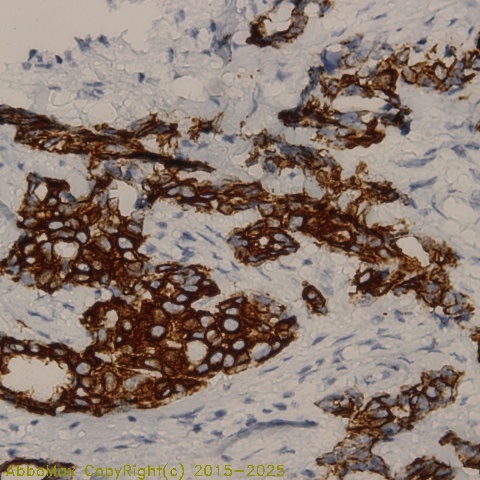 "Cytokeratin 16 (CK16) is a member of the keratin family, the most diverse group of intermediate filaments. Cytokeratins comprise a diverse group of intermediate filament proteins that are expressed as pairs in both keratinized and non-keratinized epithelial tissue. The cytokeratin proteins play a critical role in differentiation, as well as tissue specialization and function, to maintain the overall structural integrity of epithelial cells. Cytokeratins are also useful markers in identifying the origin of metastatic tumors. CK16 is expressed in benign stratified squamous epithelium and squamous cell carcinoma of the head and neck, as well as luminal cells of mammary gland and sweat ducts. It is absent in noninvasive breast carcinomas and normal breast tissue. Mutations in the CK16 gene cause various diseases, including pachyonychia congenita type 1 (PC1), nonepidermolytic palmoplantar keratoderma (NEPPK) and unilateral palmoplantar verrucous nevus (UPVN)."