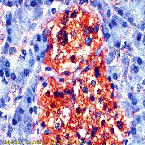 "Enolase is a cytoplasmic enzyme with three immunologically distinct subunits designated as alpha, beta, and gamma. There are five isoenzymes of enolase in normal human tissues. The gamma-subunit enolase, known as neuron-specific enolase (NSE), is expressed primarily in neurons, in normal and n neoplastic neuroendocrine cells. In normal tissues, most neurons and their axonal and dendritic processes stain strongly positive for NSE,with the exception of Purkinje cells. Schwann cells, cells of the adrenal medulla and paraganglia also contain NSE. Endocrine cells of the skin (Merkel’s cells), respiratory and GI tract epithelium, pituitary parathyroid, pancreatic islets, and C cells of thyroid all stain positive for NSE. NSE has been demonstrated in ganglioneuromas, neuroblastomas, schwannomas and malignant melanomas. It is also present in pheochromocytomas and paragangliomas. Carcinoids, medullary thyroid carcinomas, pituitary adenomas, and endocrine tumors of the pancreas and GI tract all show positive immunoreactivity for NSE. NSE is found in neuroendocrine carcinoma of the skin (Merkel’s cell tumor) and small cell carcinoma of the lung. A number of non-neuronal and non-endocrine tumors may also express NSE, including meningiomas, astrocytomas, renal cell carcinomas, carcinoma and fibroadenoma of the breast, carcinoma of the ovary, and malignant lymphomas. NSE positivity should not be relied upon entirely as evidence of the neuronal or neuroendocrine differentiation of a given neoplasm."