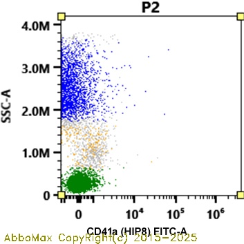 "CD41 is a 125/25 kD subunit of the gpIIb/IIIa (CD41/CD61) complex. CD41 is a heterodimer composed of a heavy chain (gpIIb?) and light chain (gpIIb?) linked by a single disulfide bond. It is a member of the integrin family primarily expressed on platelets and megakaryocytes. CD41 has been reported to be involved with platelet aggregation and platelet attachment to the ECM. CD41/CD61 complex acts as the receptor for fibrinogen, fibronectin, Von Willebrand factor, and thrombin."