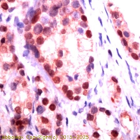 "The Nkx3.1 gene encodes an androgen regulated prostate-specific homeobox-containing transcription factor. This transcription factor functions as a negative regulator of epithelial cell growth in prostate tissue. In mice the homologue Nkx3.1 is exclusively expressed in prostate epithelium. In humans, Nkx3.1 expression is also restricted to the prostate. Many data show that Nkx3.1 expression is highly, but not exclusively, specific for the prostate. Aberrant expression of this gene is associated with prostate tumor progression."